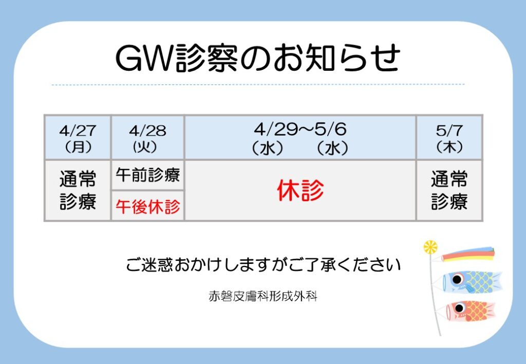 4月28日(火)午後~5月6日(水)まで休診とさせていただきます。